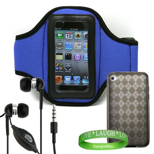 Apple iPod Touch 4th Generation Accessories Kit: Dark Blue Exercise Neoprene Armband + Smoke Crystal TPU Argyle Skin + No- hands iPod Touch 4th Generation Earphones with microphone + VG Live * Laugh * Love Wrist Band!!! Make Sure Your iTouch is CoveredProtect your brand new Apple iTouch 4 against scratches and damages while exercising with this well designed high-density neoprene armband. The cover itself is made out of Scratch-resistant neoprene that has been woven over multiple times to make it as dense and protective as we possibly could make it. We wanted to make sure that the iTouch 4 was safe and secure once inside the armband and we believe we accomplished just that. Armband is One-size fits all and so durable and well designed that we have imposed an extended warranty on our work, when purchased from Vangoddy. Accessories are NON-OEM!!! Defend yourself, defend your iTouch 4: Get a protective Neoprene Exercise Armand for Apple iTouch today! 90 Day Customer Satisfaction Warranty when purchase from Vangoddy ! This product is not affiliated with Apple, Inc. The terms "iPod" and "iPhone" are used for compatibility purposes only. iPhone and iPod trademarks are the property of Apple Inc. *** iTouch 4 NOT Included***